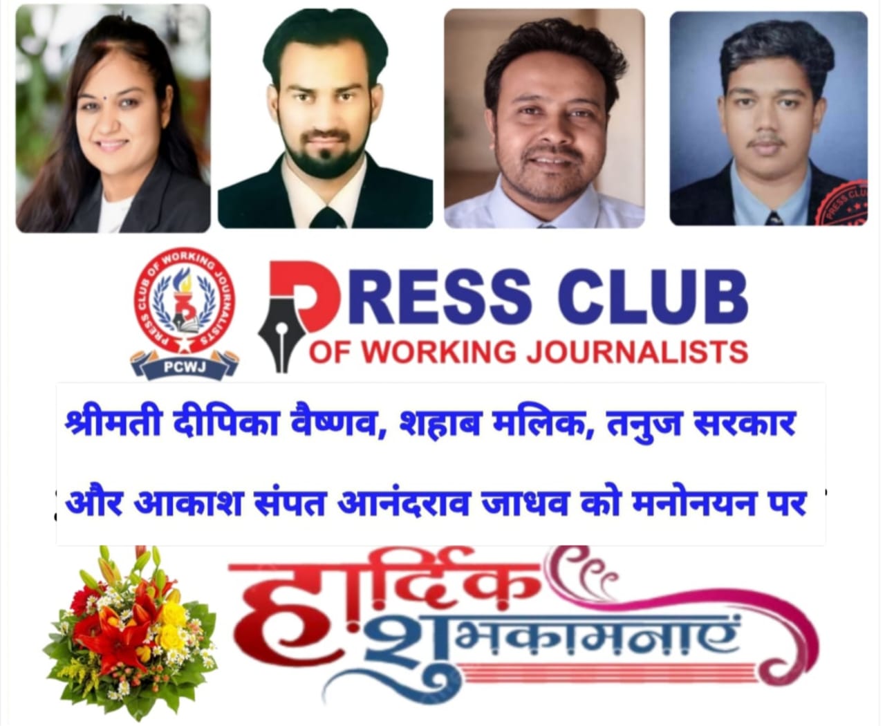 मुम्बई। पत्रकार सुरक्षा एवं कल्याण के लिए प्रतिबद्ध अखिल भारतीय संगठन “प्रेस क्लब ऑफ वर्किंग जर्नलिस्ट्स पंजीकृत” के संस्थापक अध्यक्ष डॉक्टर सैयद खालिद कैस एडवोकेट द्वारा आगामी आदेश तक के लिए संगठन के विधिक सलाहकार विभाग मध्य प्रदेश इकाई के प्रदेश संयोजक पद पर वरिष्ठ महिला अधिवक्ता श्रीमती दीपिका वैष्णव भोपाल को, संगठन के प्रदेश प्रवक्ता पद सहित प्रदेश कार्यालय प्रभारी का भी दायित्व क्रांतिकारी पत्रकार शहाब मलिक को मनोनीत किया है। साथ ही छत्तीसगढ़ के क्रांतिकारी पत्रकार श्री तनुज सरकार को कांकेर जिला अध्यक्ष पद पर और युवा पत्रकार आकाश संपत आनंदराव जाधव को आगामी आदेश तक के लिए कोल्हापुर इकाई का जिला अध्यक्ष मनोनीत किया गया है।